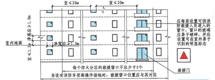 3、每個(gè)防火分區(qū)的救援窗口不應(yīng)少于2個(gè),當(dāng)設(shè)有消防車登高操作場地時(shí),救援窗口位置應(yīng)與其對應(yīng)。