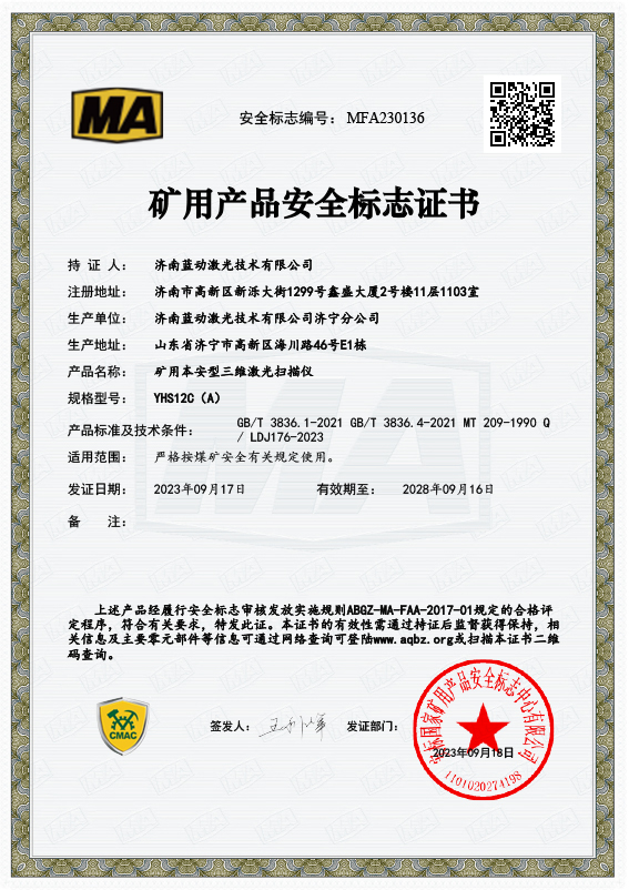 YHS12C(A)礦用本安型三維激光掃描儀安標(biāo)證(MFA230136)